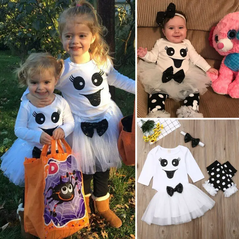 ORIGINAL 4PCS Newborn Baby Girls Outfits Clothes Terror Print Bodysuit Lace Tutu Skirts Set Infant Sundress
